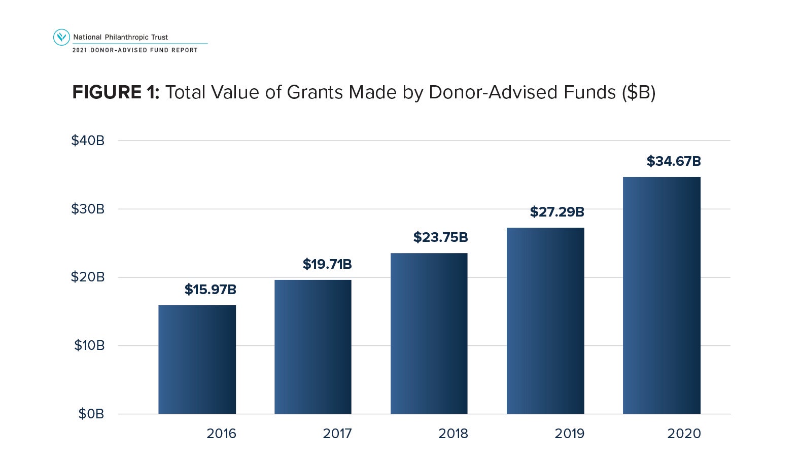 Donor-advised funds (DAFs) are a giving vehicle that enables donors to support charitable organizations and causes. The first DAFs were established nearly a century ago at community foundations. Today, they exist at different types of charitable sponsors, such as universities, hospitals, charities affiliated with corporate entities and those connected to religious institutions. Many donors use DAFs for traditional individual and family giving, and an increasing number have adapted DAFs to facilitate workplace giving programs, online fundraising platforms and other models that expand philanthropy. National Philanthropic Trust (NPT) provides this report as a public service to those who are interested in the impact of this charitable giving vehicle.