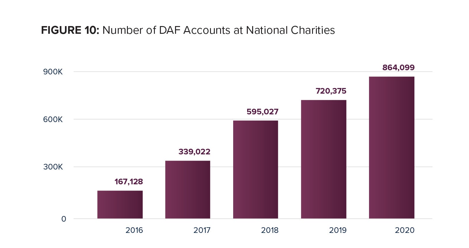 The number of individual DAF accounts at National Charities grew to an estimated 864,099 in 2020 from a revised 720,375 in 2019, an increase of 20.0 percent. This one-year growth is a decrease from a compound annual growth rate of 50.8 percent from 2016 to 2020. This high degree of annualized growth includes newly established National Charities, including some with low or no minimum account thresholds and at least one DAF sponsor that offers workplace DAF accounts. The number of DAF accounts at National Charities is more than six times the number of DAF accounts at the other two types of charitable sponsors combined.