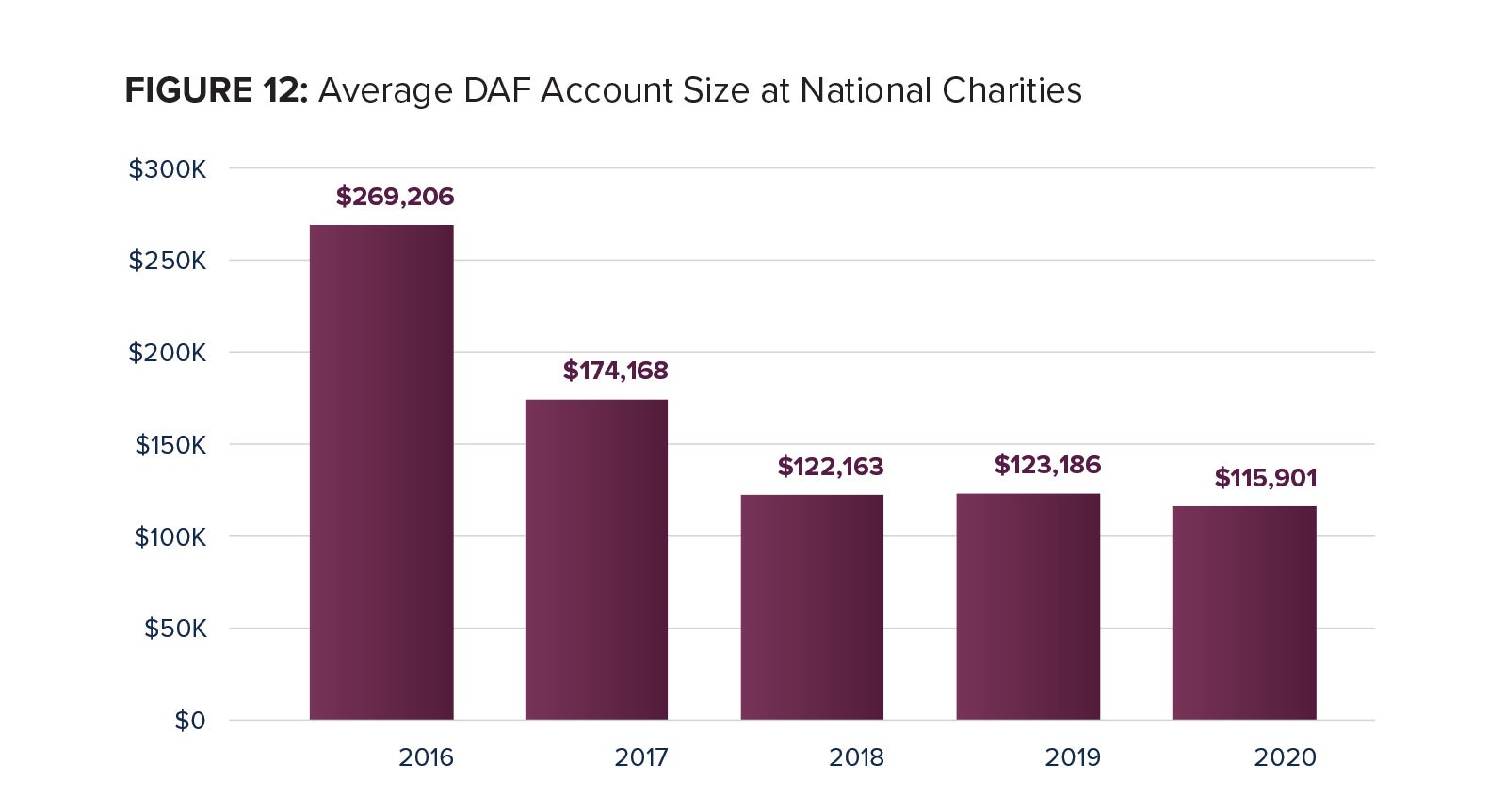 The average DAF account size at National Charities in 2020 is estimated at $115,901. This represents a 5.9 percent decrease compared with the revised 2019 average of $123,186. The average account size has declined at a compound annual rate of 19.0 percent from 2016 to 2020, reflecting the increase in the number of DAF accounts at some newer National Charities, including those with smaller DAF accounts used for workplace giving and online giving platforms.