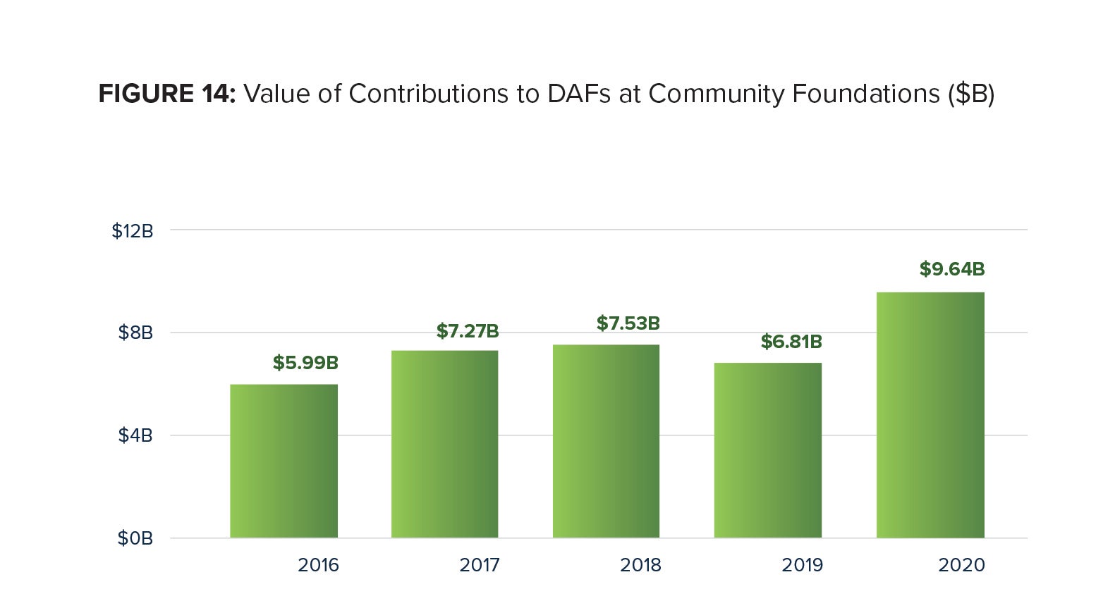 Total contributions to DAFs at Community Foundations were $9.64 billion in 2020, a 41.5 percent increase over a revised total of $6.81 billion from the prior year. The compound annual growth rate in contributions to donor-advised funds at Community Foundations from 2016 to 2020 is 12.6 percent.