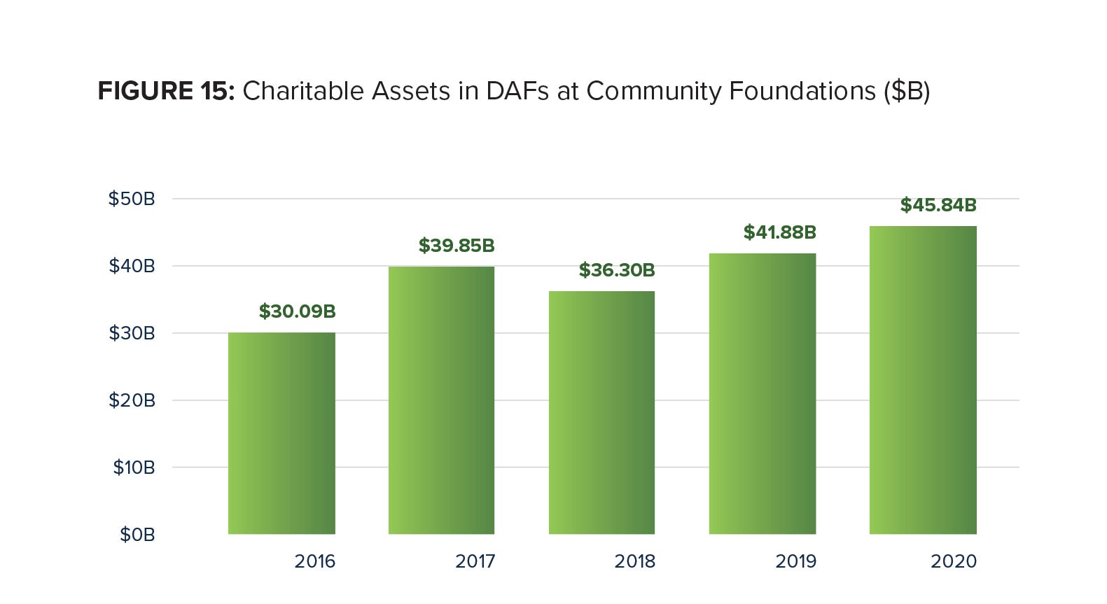 Charitable assets in DAFs at Community Foundations totaled $45.84 billion in 2020, a 9.5 percent increase from $41.88 billion in 2019. The compound annual growth rate for 2016 through 2020 was 11.1 percent.
