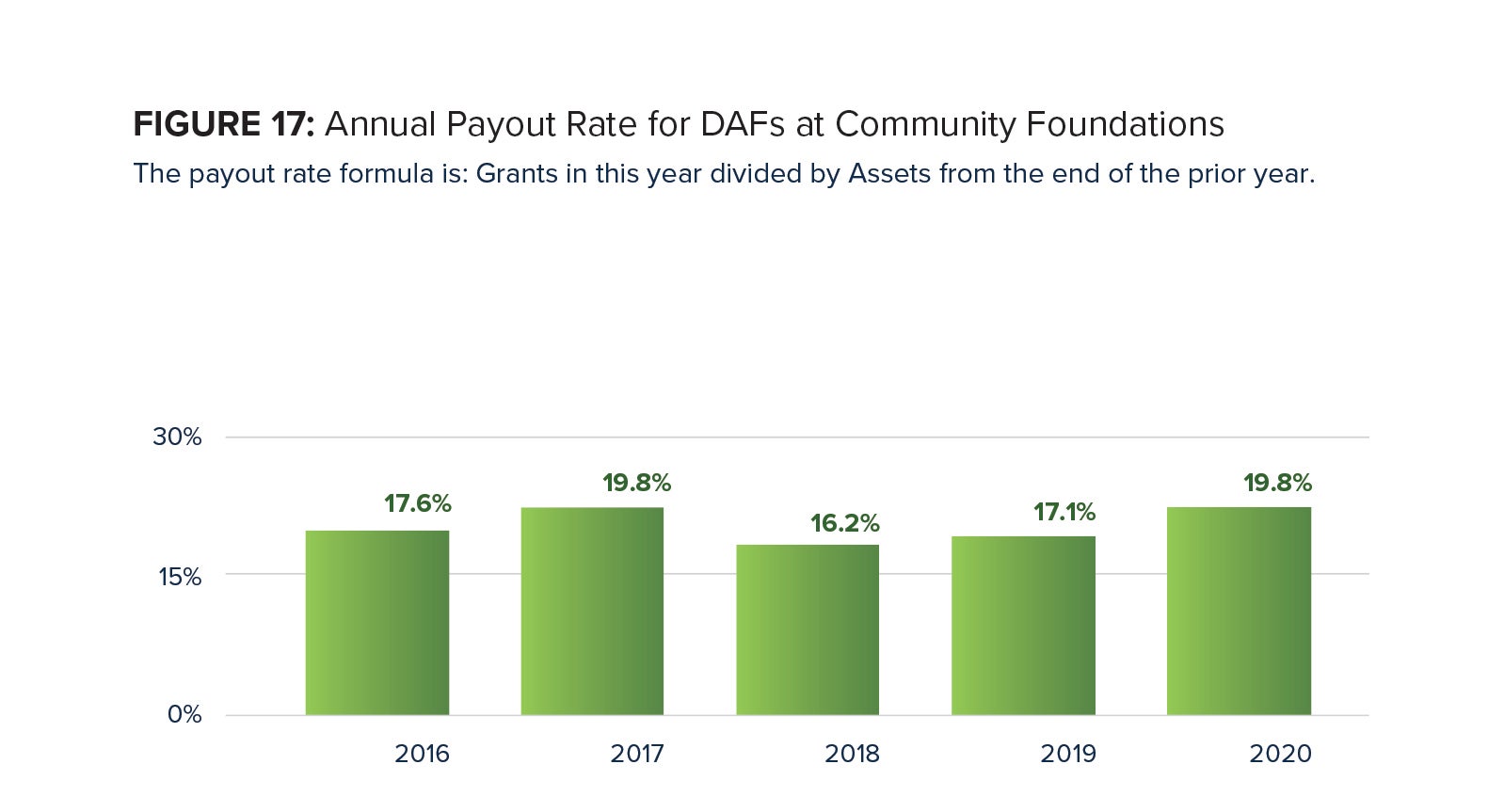 In 2014, this report began using a grant payout rate formula modeled on private foundations’ payout calculation. This formula allows us to compare two vehicles frequently used by higher-net worth donors. That formula is: