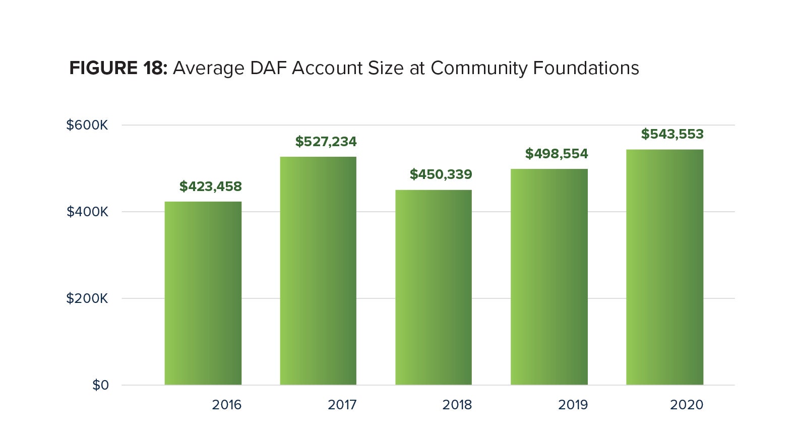 The average DAF account size at Community Foundations rose to $543,553 in 2020. This represents a 9.0 percent increase from the 2019 average of $498,554. The compound annual growth rate for average account size from 2016 to 2020 was 6.4 percent. The average DAF account size at Community Foundations is the largest among the three types of charitable sponsors.