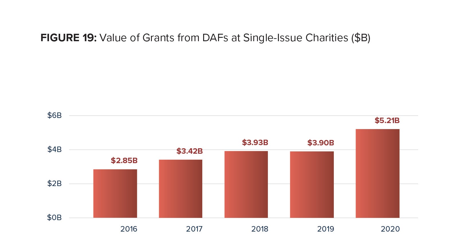 Grants from DAFs at Single-Issue Charities totaled $5.21 billion in 2020, up from $3.90 billion in 2019. This is an increase of 33.6 percent increase. The compound annual growth rate from 2016 to 2020 was 16.2 percent. Compared to 2011, DAF grants from Single-Issue Charities have increased by 264.0 percent.