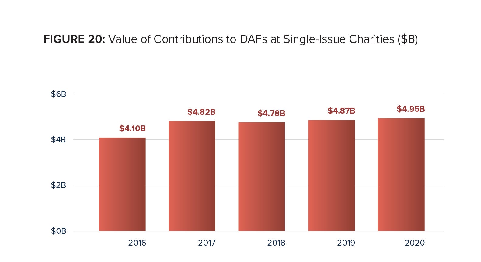 Contributions to DAFs at Single-Issue Charities totaled $4.95 billion in 2020. The change in contributions from 2019 to 2020 represents a 1.6 percent increase from the revised total of $4.87 billion for 2019. The compound annual growth rate from 2016 to 2020 was 4.8 percent. Historically, contributions to DAFs at Single-Issue Charities have been less predictable than the other two types of DAF sponsors, with the highest rate of increase at 35.1 percent in 2012 and the lowest at 7.9 percent in 2015.