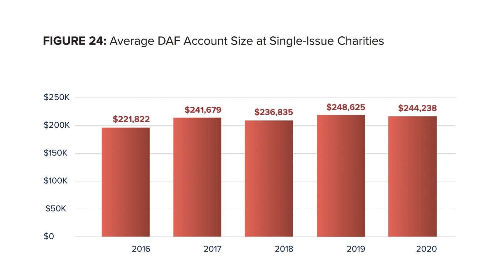 The average DAF account size at Single-Issue Charities was $244,238 in 2020. This represents a decrease of 1.8 percent compared with the 2019 average of $248,625. The compound annual growth rate from 2016 to 2020 was 2.4 percent.
