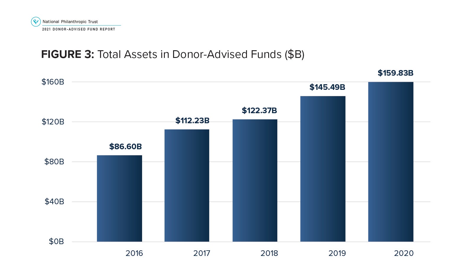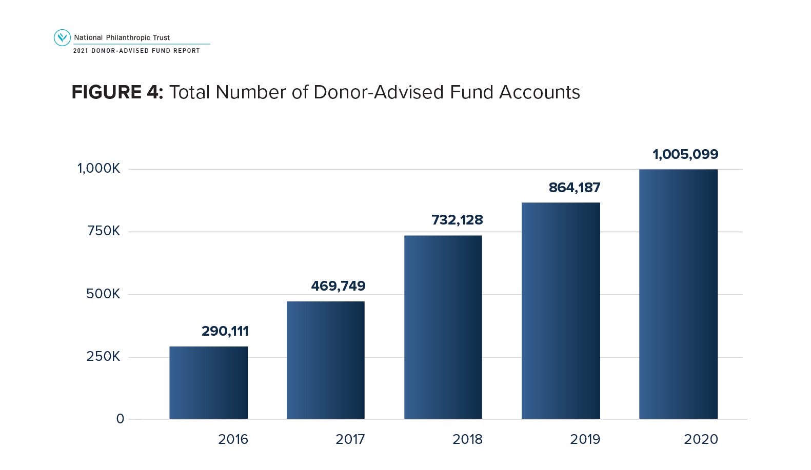 For this edition, NPT reviewed 976 organizations that reported at least $1 in assets from fiscal year 2016 through fiscal year 2020: 55 National Charities, 603 Community Foundations and 318 Single-Issue Charities. Data comes from the most recent IRS Forms 990. For some organizations whose fiscal year 2020 data was not yet publicly available, we received the data directly from the charity. Where 2020 data were not available, NPT used an estimating process. This process takes a rate of change by sponsor type for organizations where data were on file for 2019 and 2020. That rate by sponsor type was then applied to the 2019 values from IRS Form 990s, again stratified by sponsor type, to estimate a value for 2020.