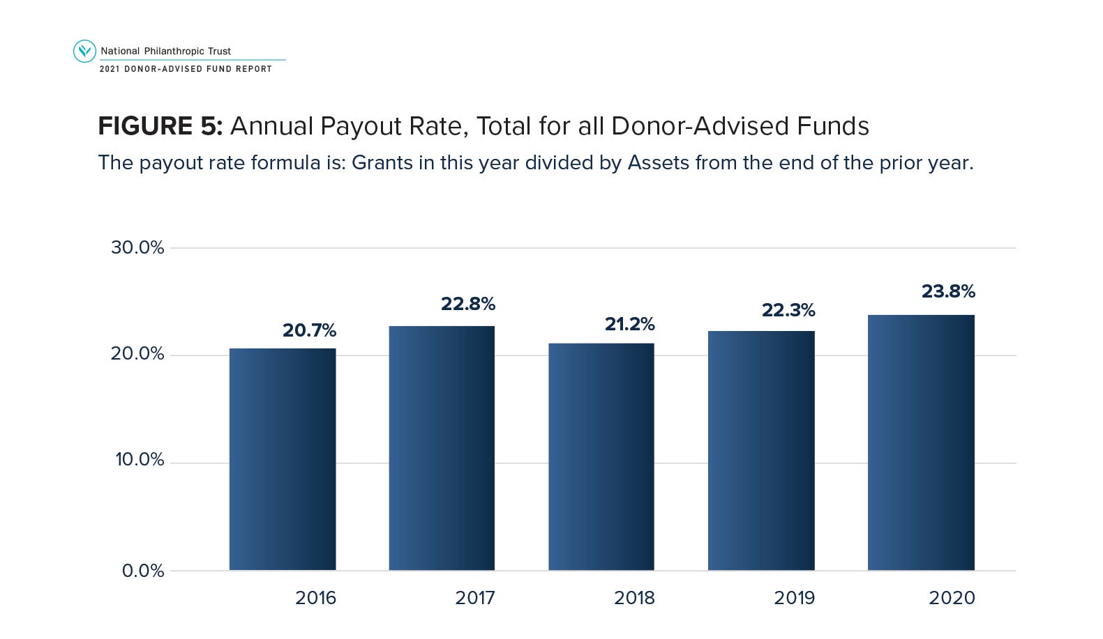 Aggregate grant payout rates from DAFs annually exceed 20 percent in every year on record. The payout rate for 2020 was 23.8 percent. This is above the revised payout rate of 22.3 percent for 2019, and is the highest on record since 2011, when the aggregate payout rate was 24.2 percent.