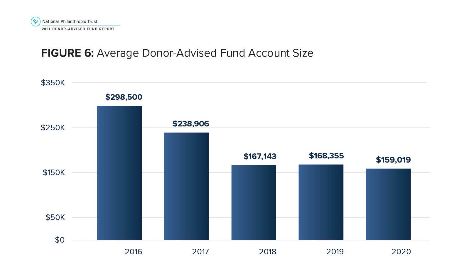 The average size of an individual DAF account is estimated to be $159,019 in 2020. This is a 5.5 percent decrease compared with the revised estimate for 2019 of $168,355. The emergence of workplace giving DAFs and sponsoring organizations that have no or low contribution minimums has affected the number of DAF accounts. Those increasing numbers combined with modest growth in charitable assets decreases the average DAF account size.