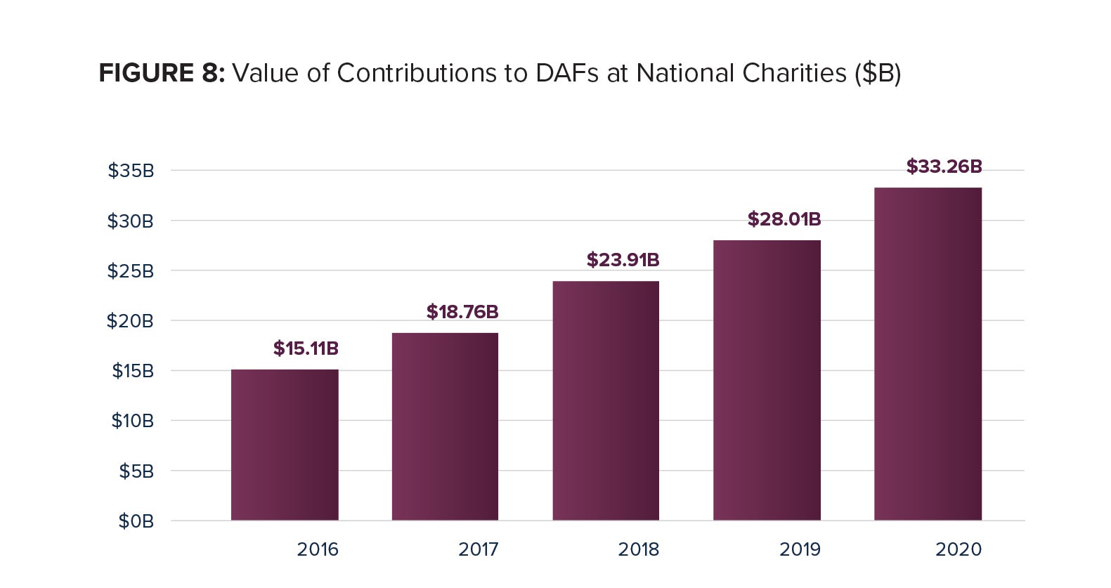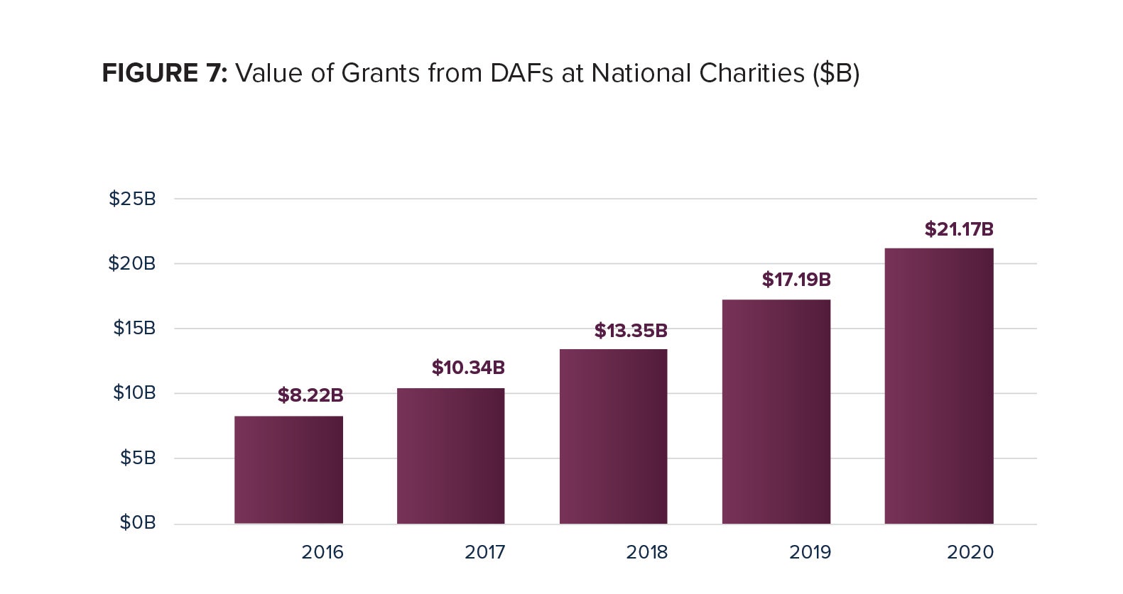 In the 2020 Donor-Advised Fund Report, we predicted growth in contributions to DAFs and grants from DAFs, particularly at National Charities. The data in this year’s report supports our earlier predictions and we recognize the numerous events of 2020 that contributed to that growth.