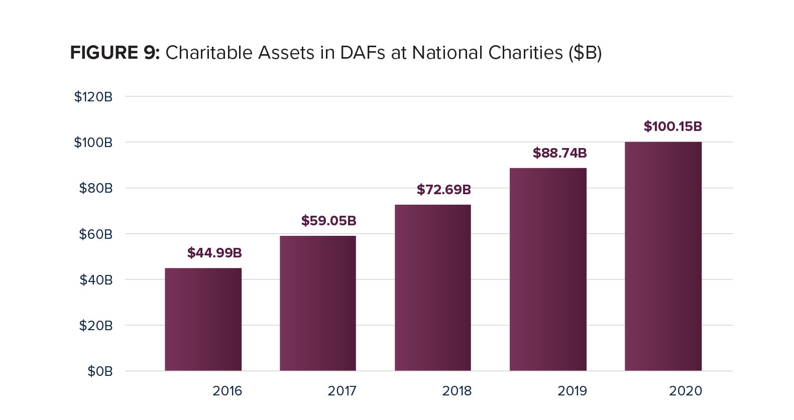 Total charitable assets in DAFs at National Charities totaled $100.15 billion in 2020, a 12.9 percent increase from a revised 2019 estimate of $88.74 billion. The compound annual growth rate for charitable assets at National Charities from 2016 through 2020 was 22.1 percent. A simple ten-year average rate of change in charitable assets is 23.2 percent.