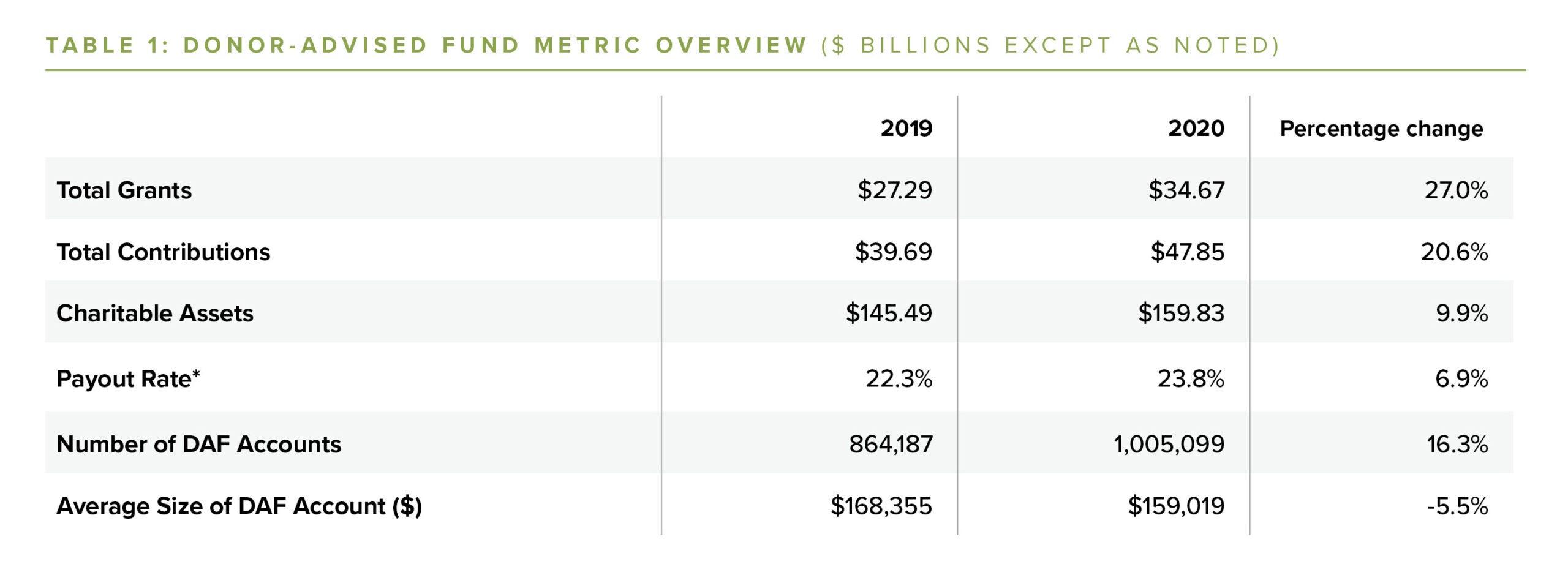 DAFs increased in all key metrics in 2020, continuing more than a decade of DAF donor commitment to philanthropy.