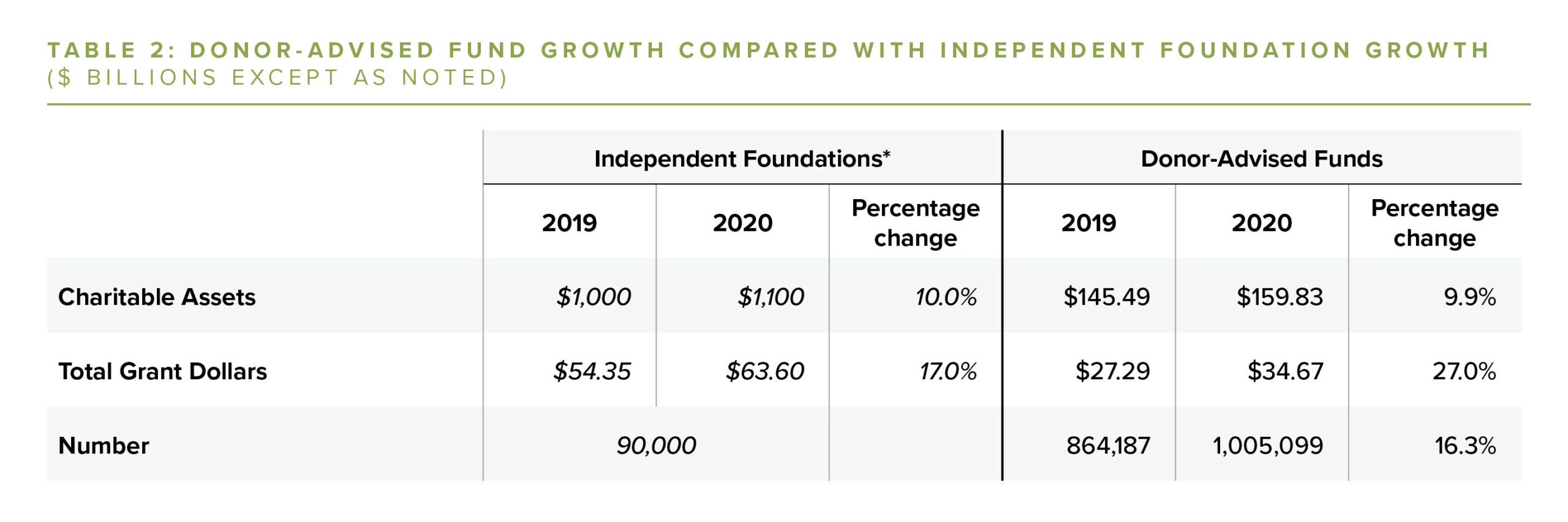 Table 2 shows an estimated total of 1,005,099 DAF accounts in 2020 among all charitable sponsors included in this report. This number compares with approximately 90,000 independent (non-corporate) foundations, also called private foundations.