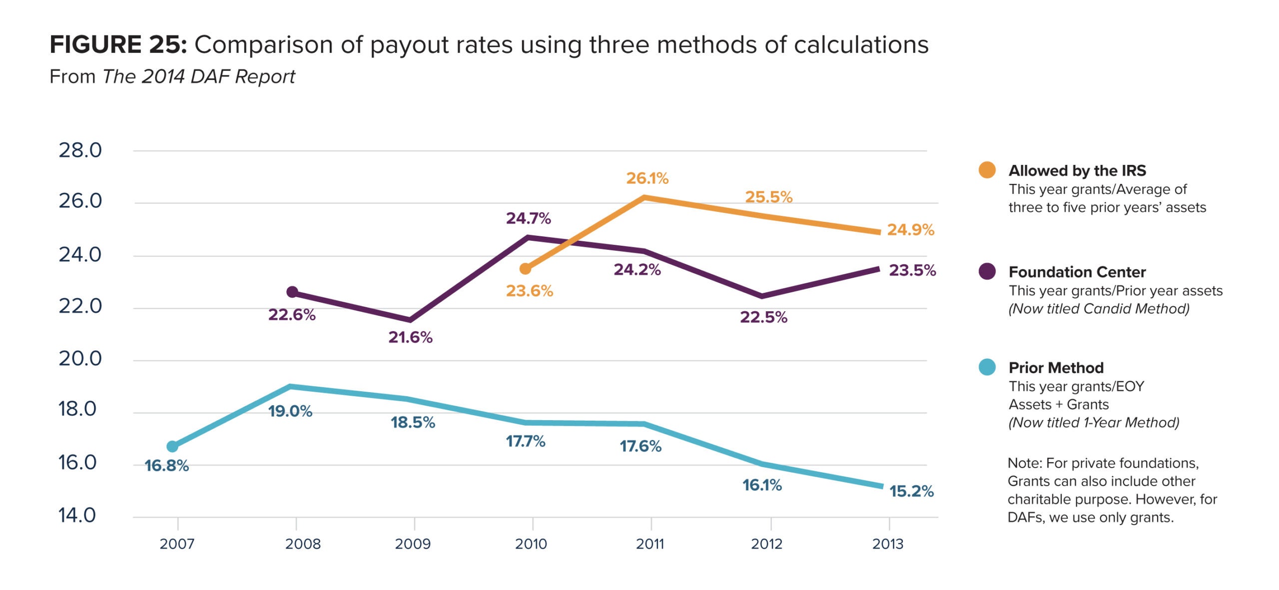 As shown in the Methodology section in the 2014 report, switching to the Candid Method, which uses last year’s assets, results in a higher payout rate. All methodologies consistently demonstrate that DAF payout has been well above 5.0 percent — even above 14.0 percent.