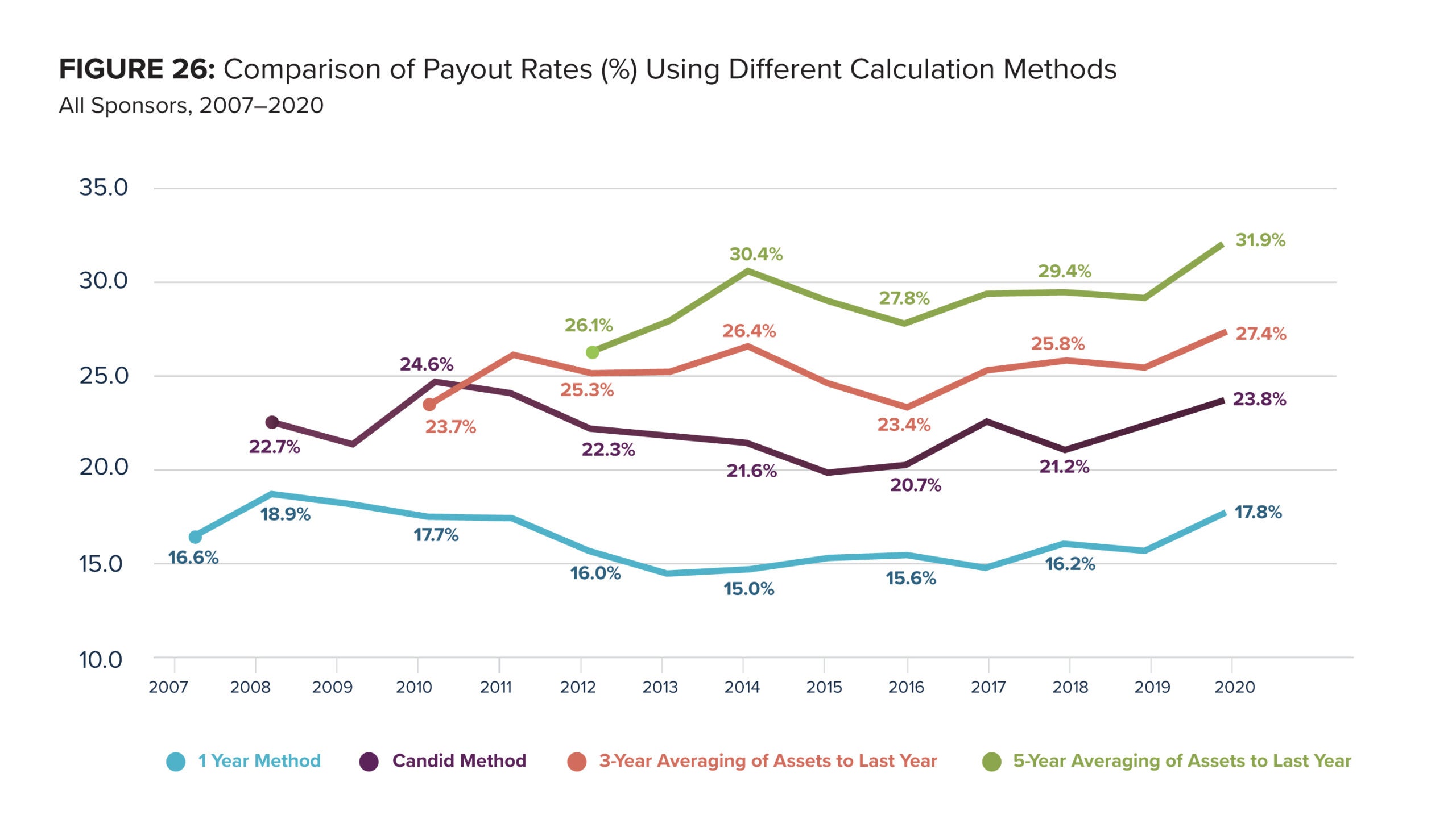Payout calculations for 2007-2020 with the most recent data available (including expanded list of donor-advised fund sponsors and regular updates from IRS Forms 990 as they are available) and additional methods are: